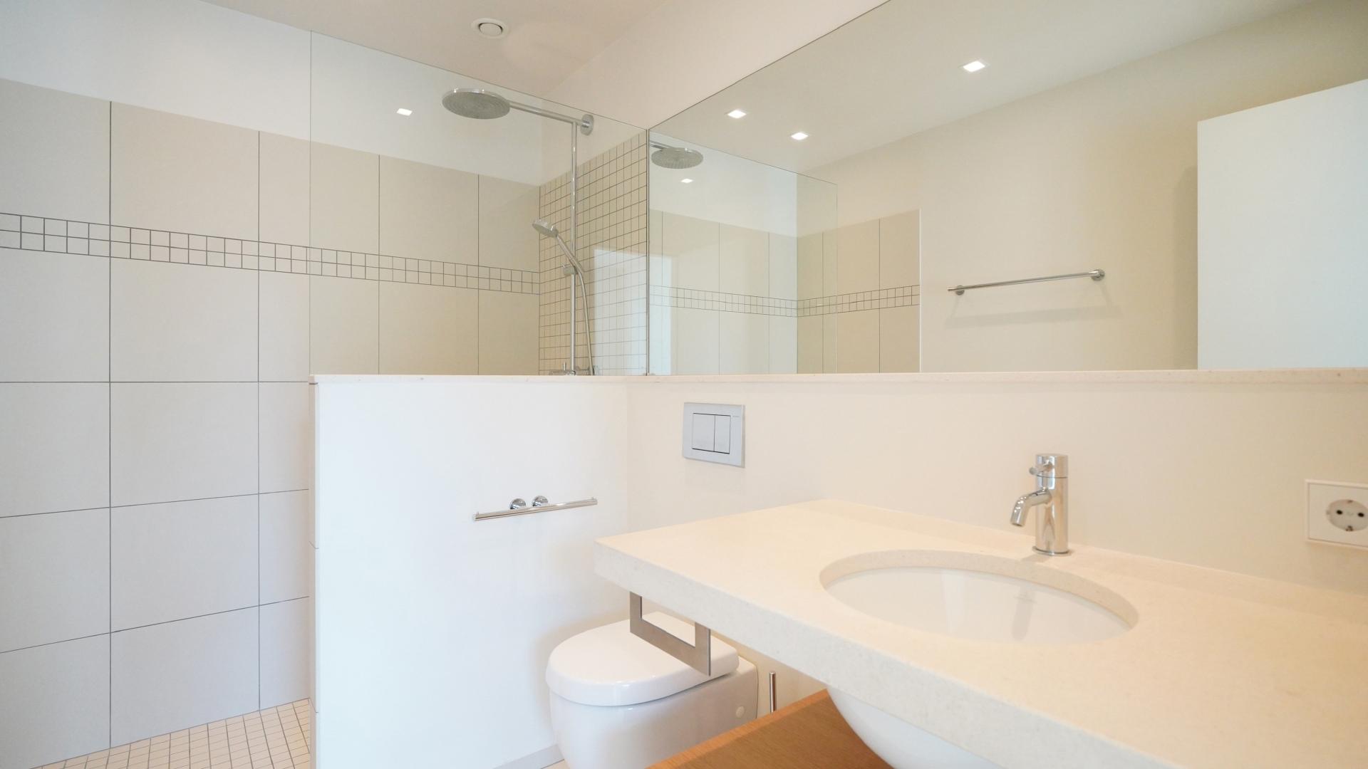 The 87 sqm apartment on the 1st floor has an entry hall with a wardrobe, a fully equipped kitchen with access to a large living room, and a west-facing terrace.