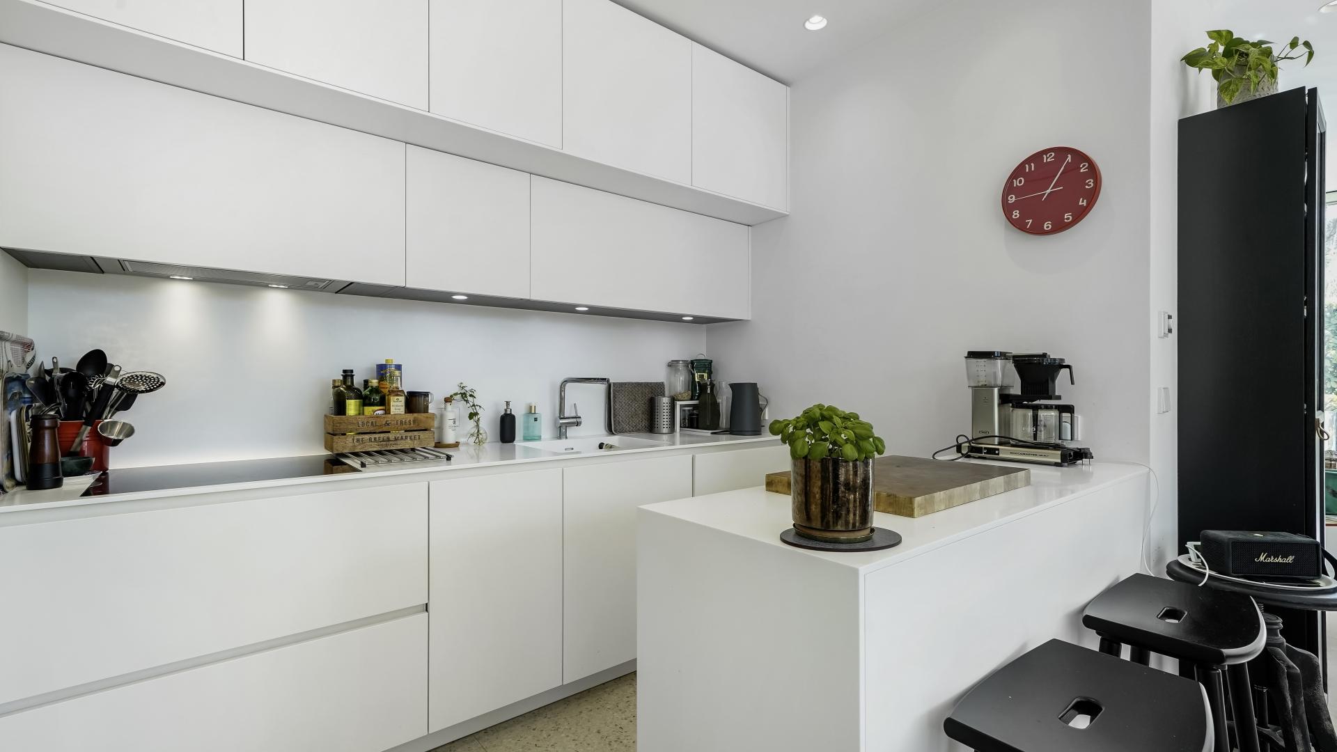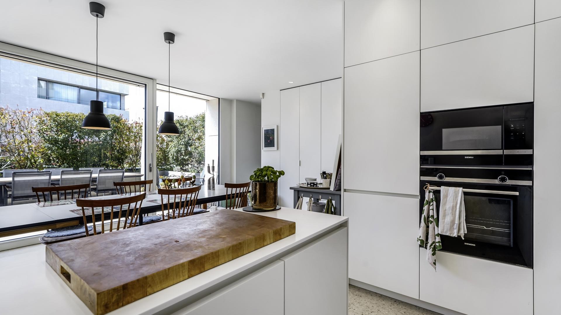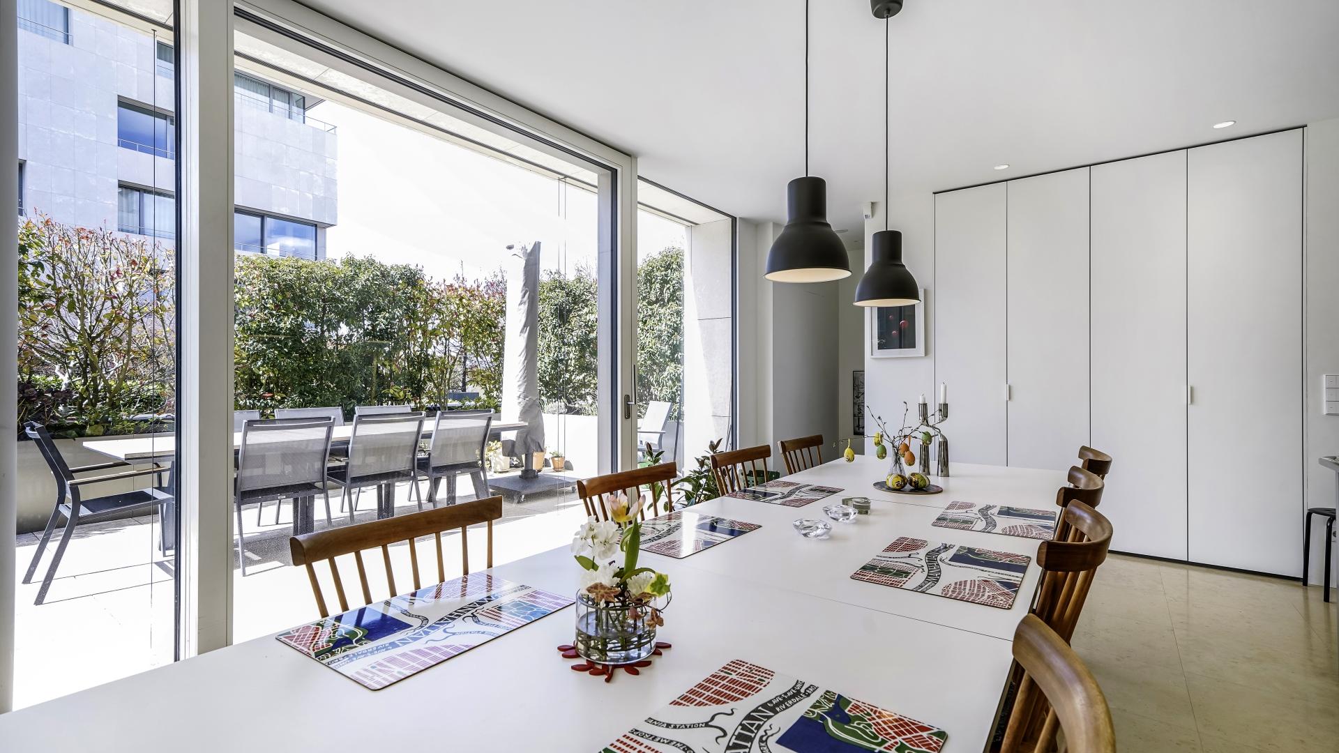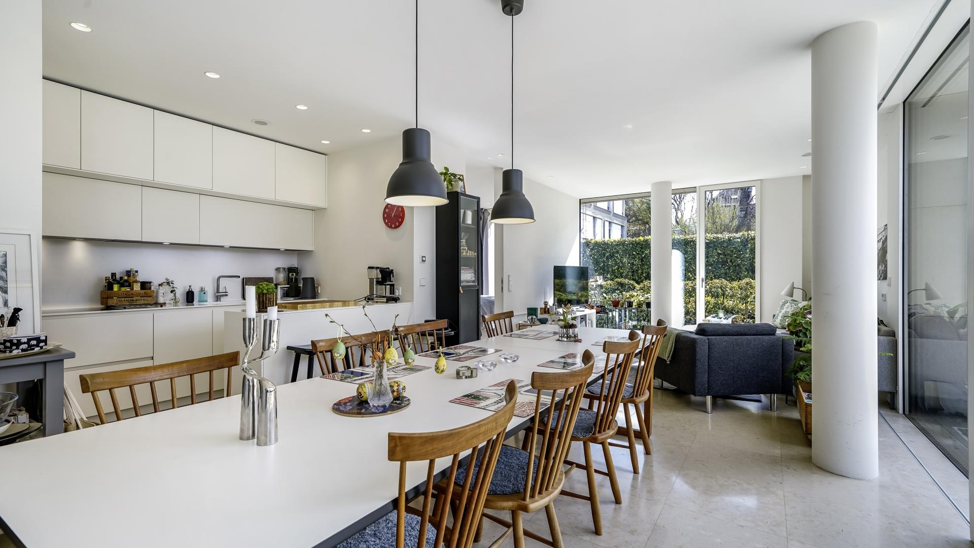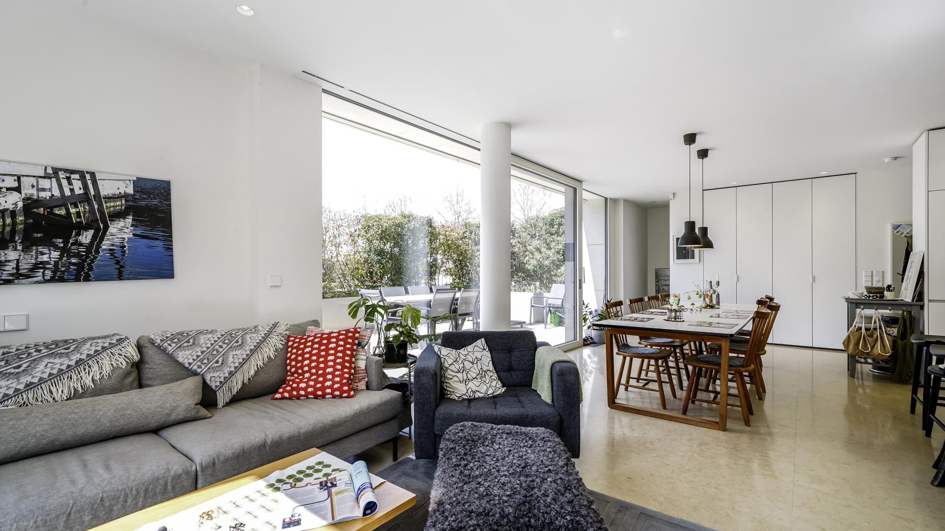 This 120 sqm apartment is located on the ground floor of a remarkable residential structure. It comprises an entrance hall with a wardrobe, a fully equipped kitchen, connected to a large living room with a stunning large terrace of ± 43 sqm, as well as a separate toilet.