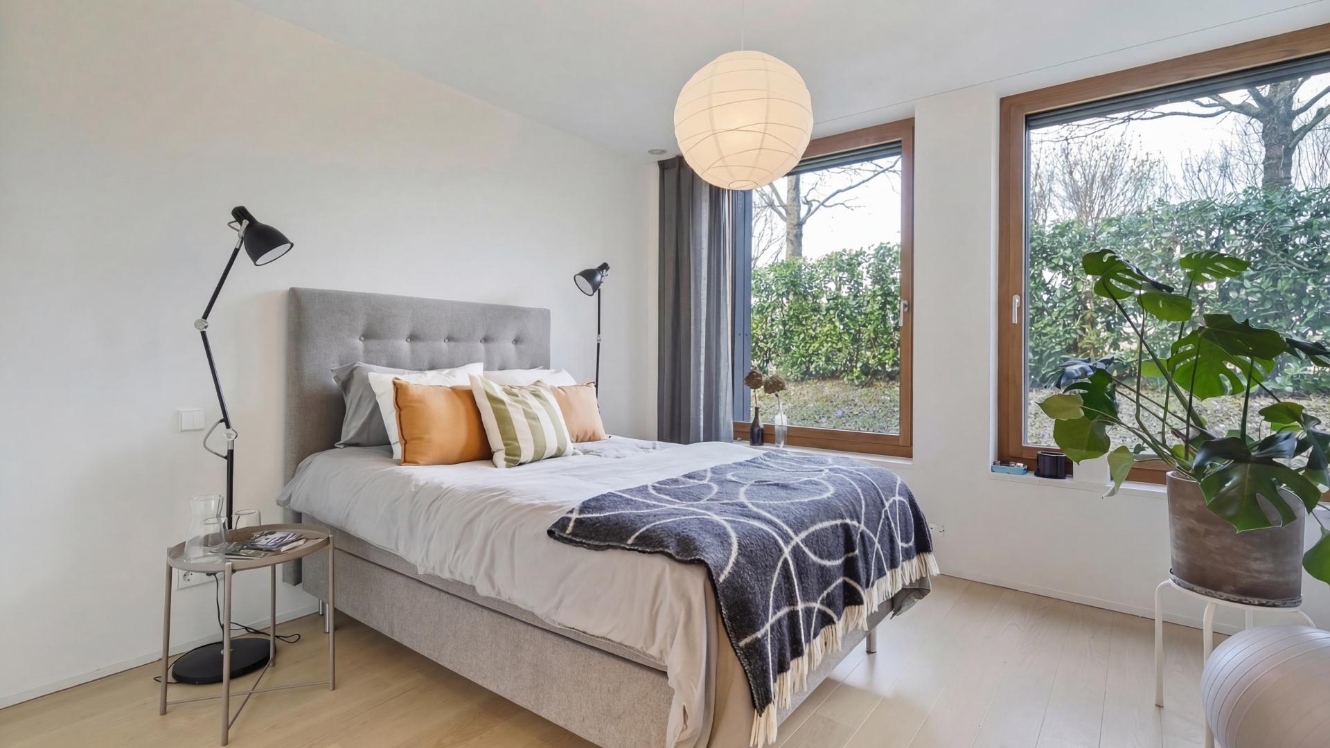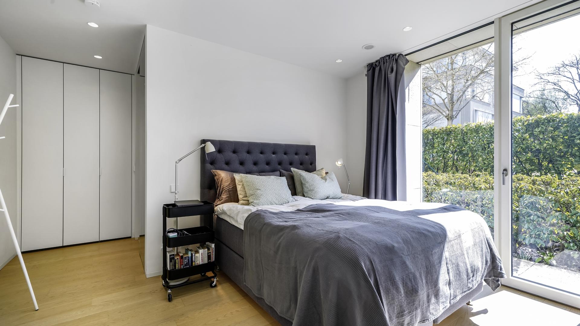 It consists of a master bedroom with access to a terrace, an en-suite bathroom with shower and a toilet. Additionally, on the lower level, there is one more bedroom, a bathroom with toilet as well as a a laundry room and a storage room.