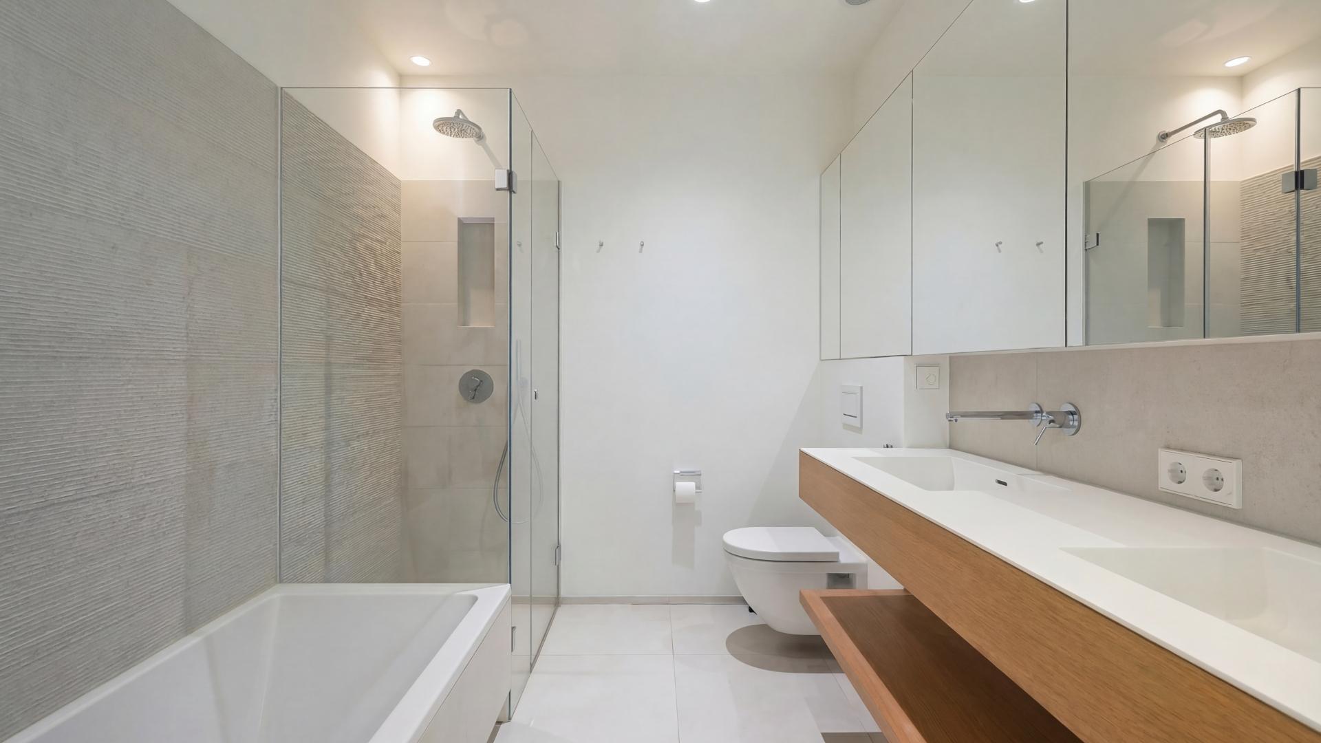 L’appartement comprend une chambre parentale avec accès à la terrasse, une salle de bains en suite avec douche et wc. Au niveau inférieur, se trouvent une chambre supplémentaire, une salle de bains avec wc ainsi qu’une buanderie et un débarras.