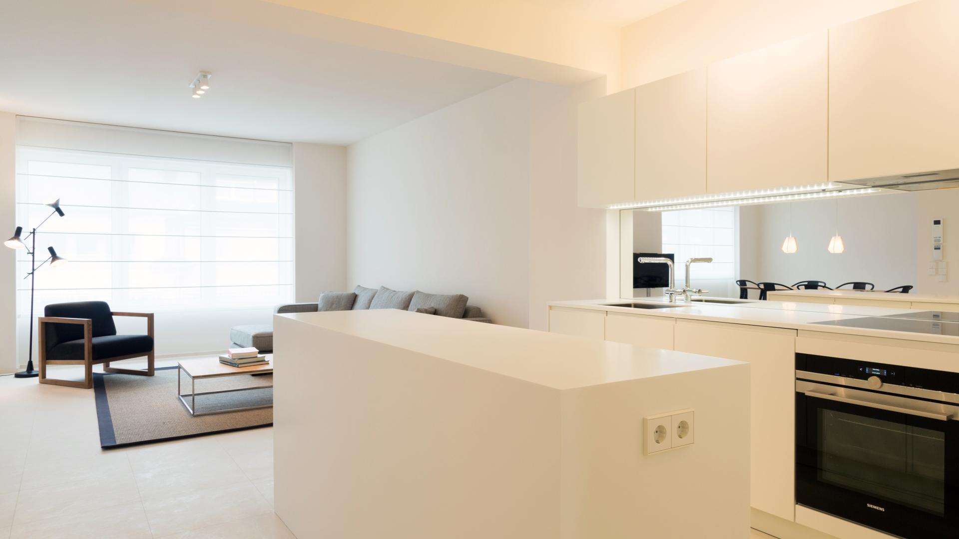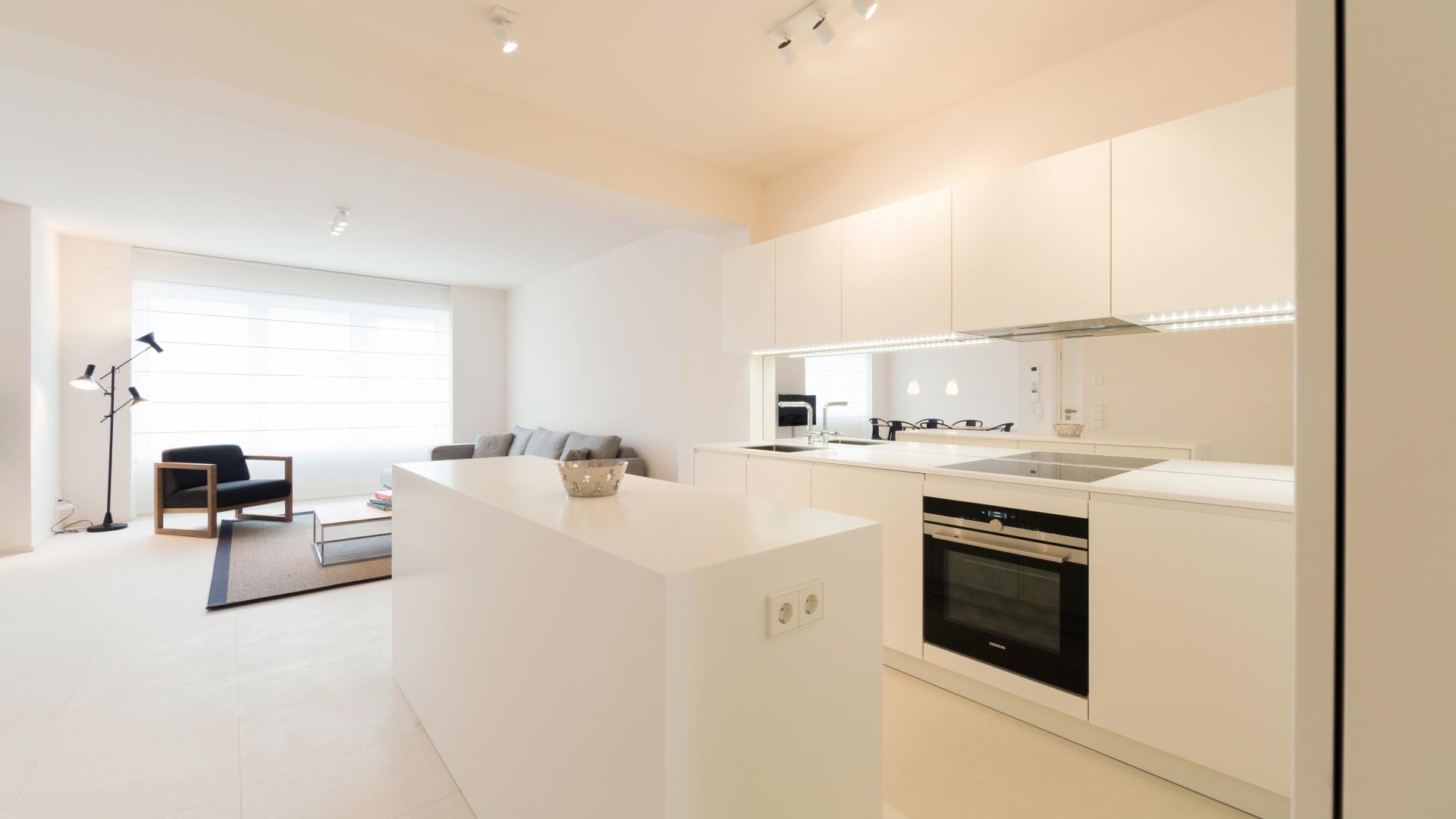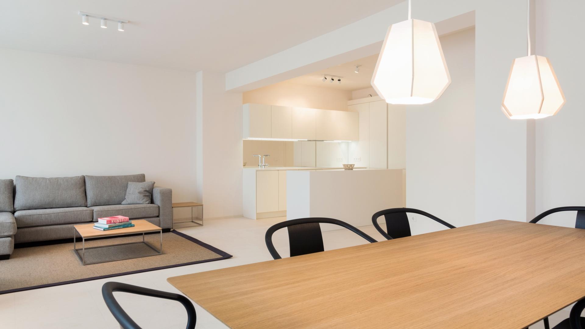 Situé au 1er étage, ce sublime appartement de ±98 m² offre une entrée avec placards, un wc séparé, ainsi qu’un séjour de ±45 m² avec une cuisine d'architecte équipée.