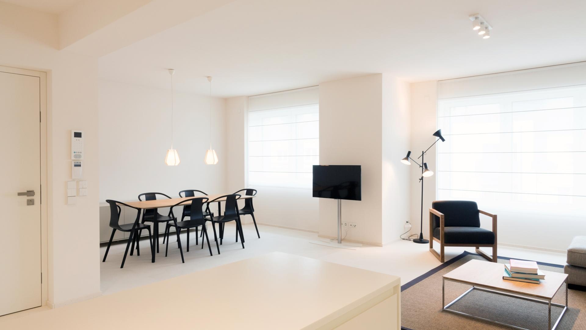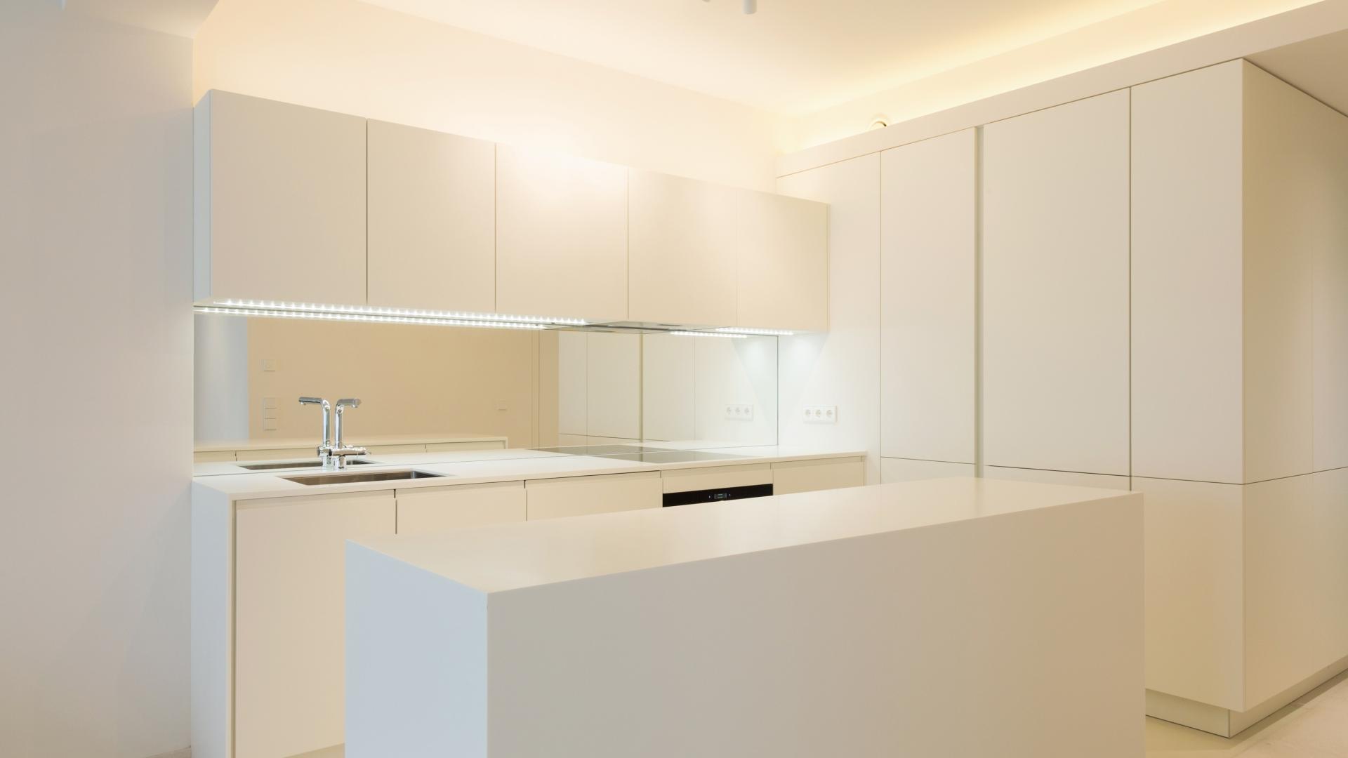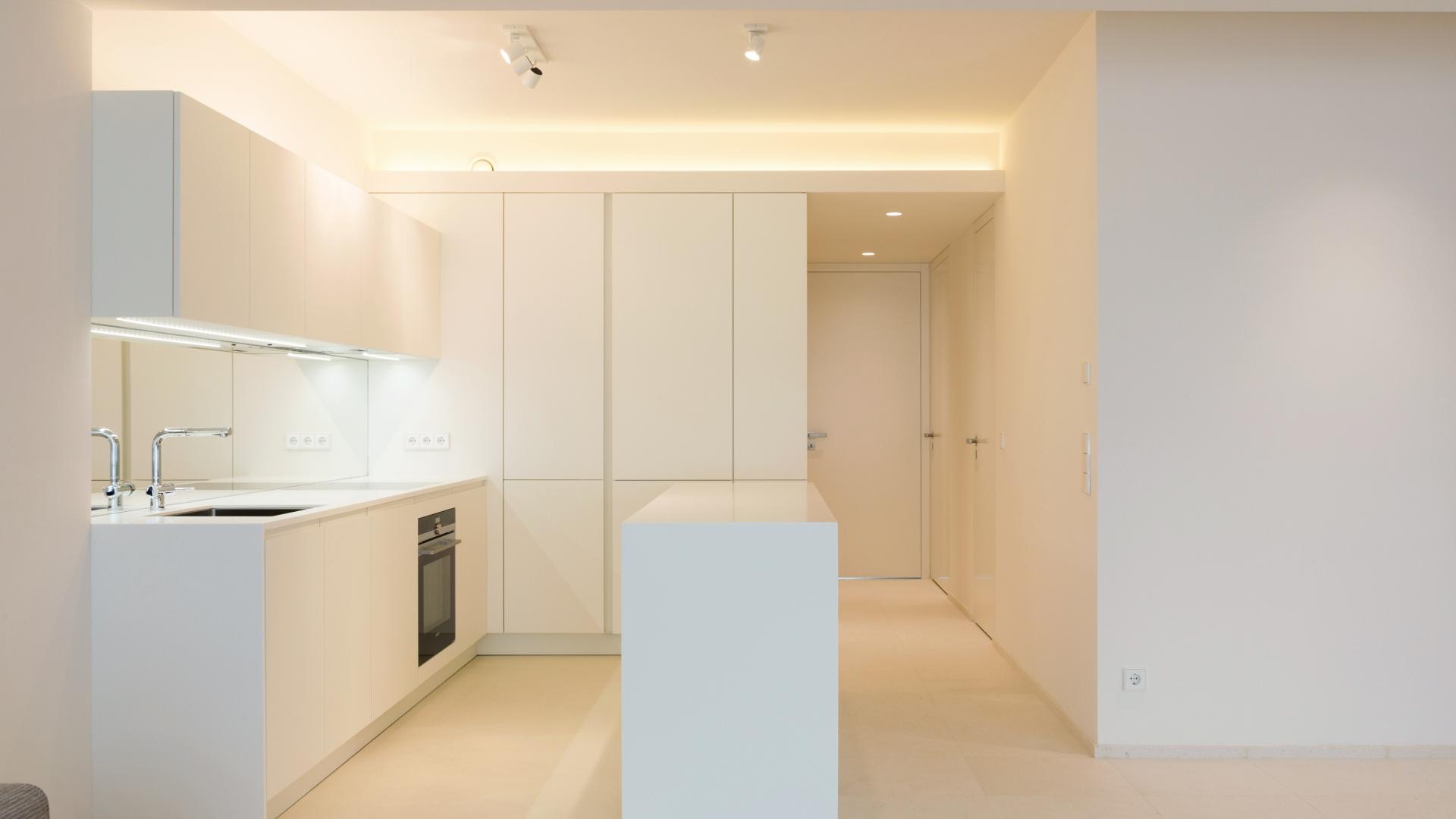 Situé au 1er étage, ce sublime appartement de ±98 m² offre une entrée avec placards, un wc séparé, ainsi qu’un séjour de ±45 m² avec une cuisine d'architecte équipée.