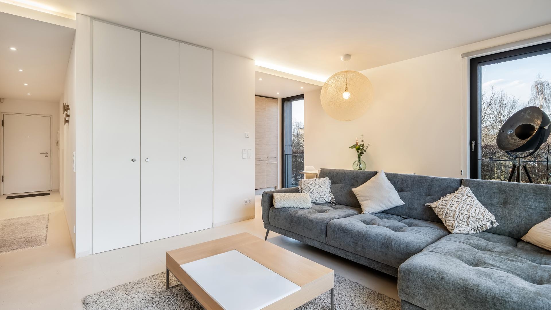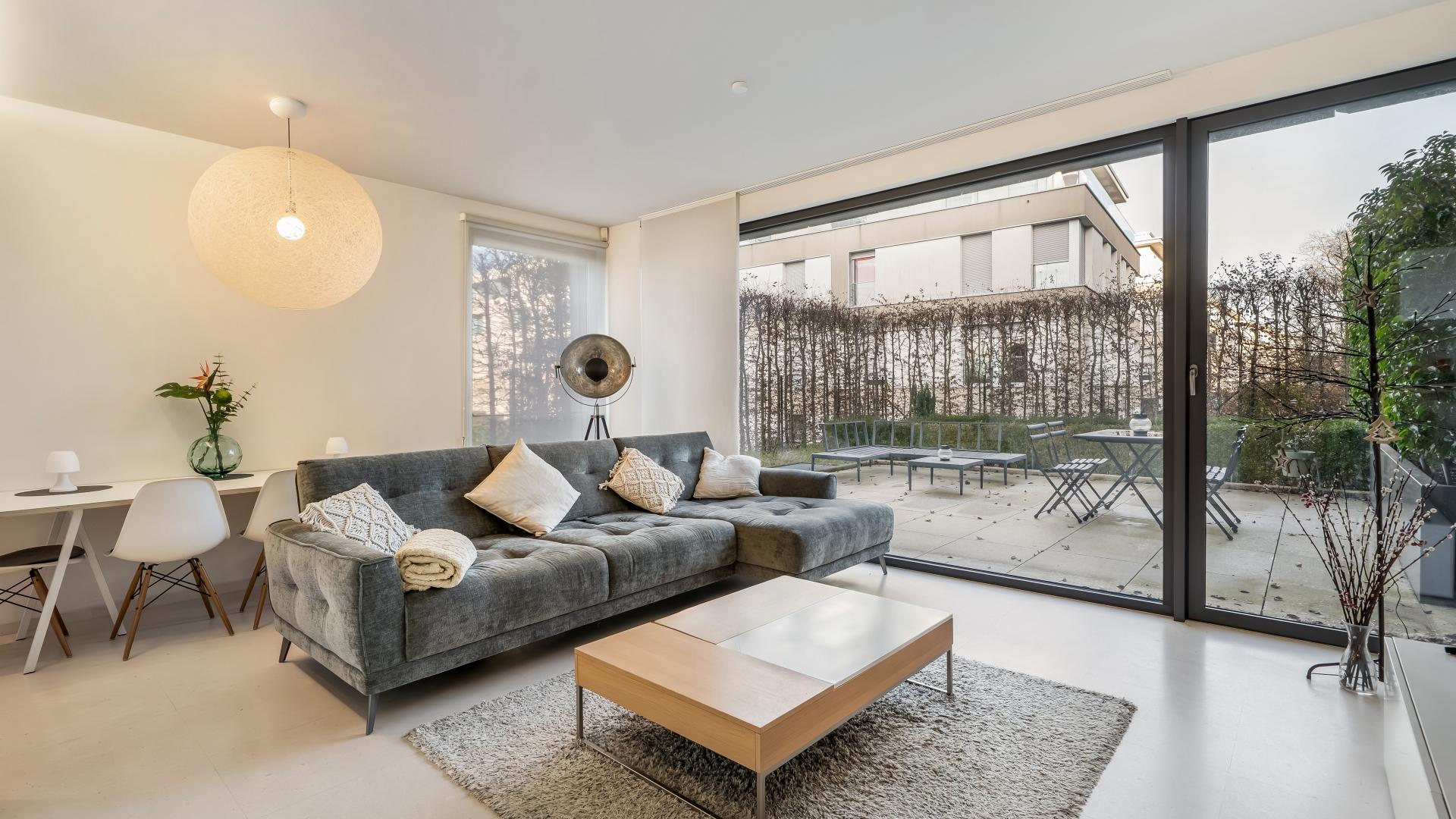 This apartment is located at No. 116 Avenue Pasteur, a peaceful yet convenient location just moments away from the city center, supermarkets, restaurants, parks, forests, bus lines, and the tram that connects Kirchberg to the central railway station.