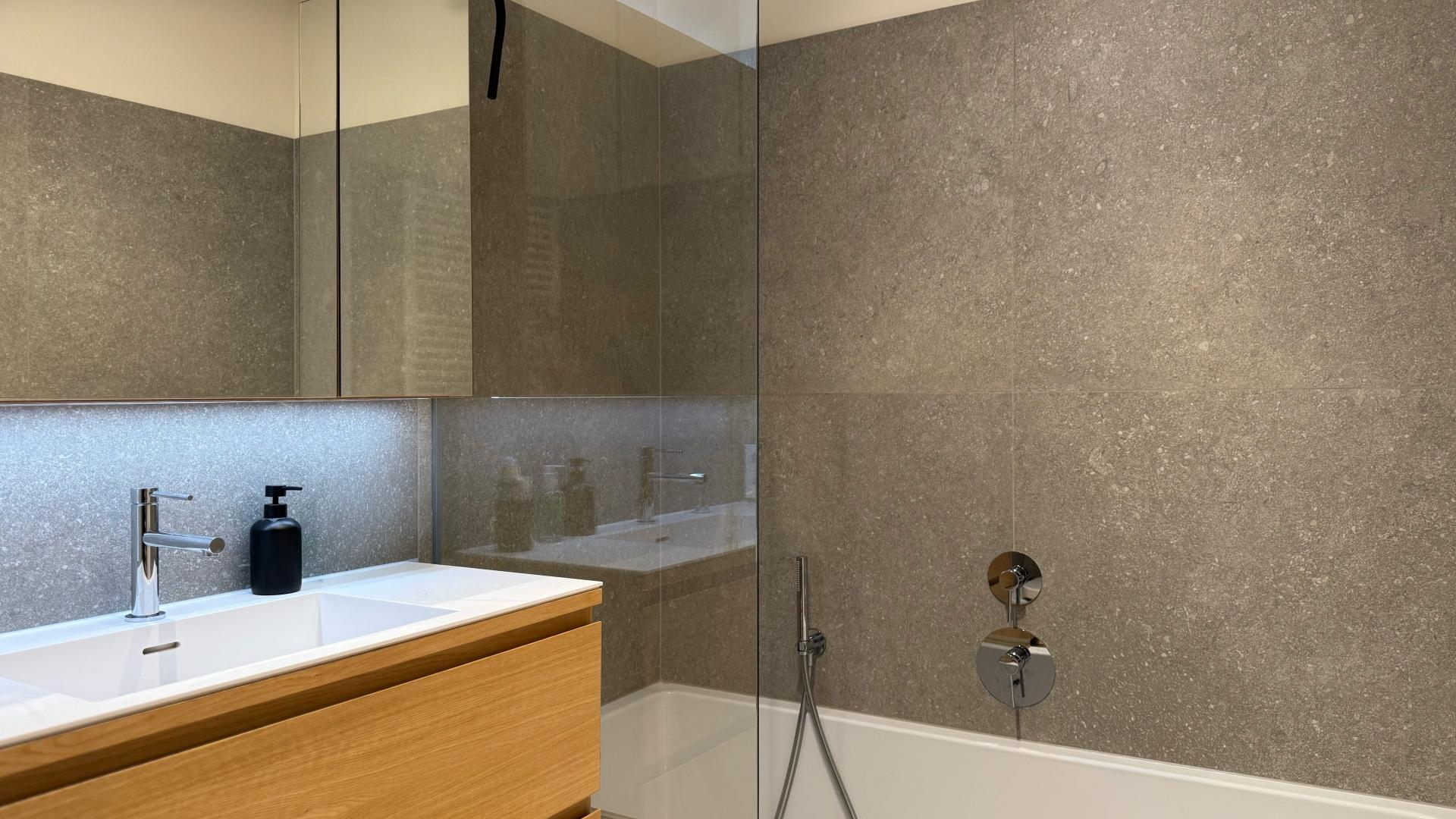 Au rez-de-chaussée, cet appartement de ±63 m² se compose d’un hall d’entrée avec placards, d’une cuisine ouverte sur le séjour avec accès à un balcon, d’une chambre avec placards, d’une salle de bains avec wc ainsi que d’un wc séparé.