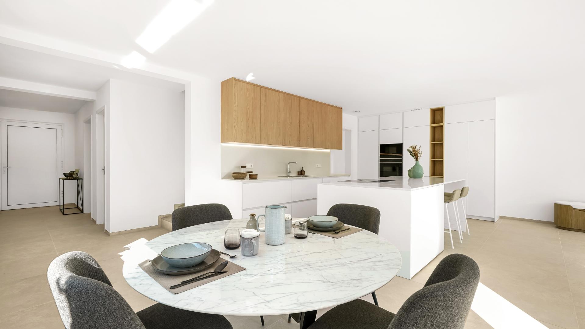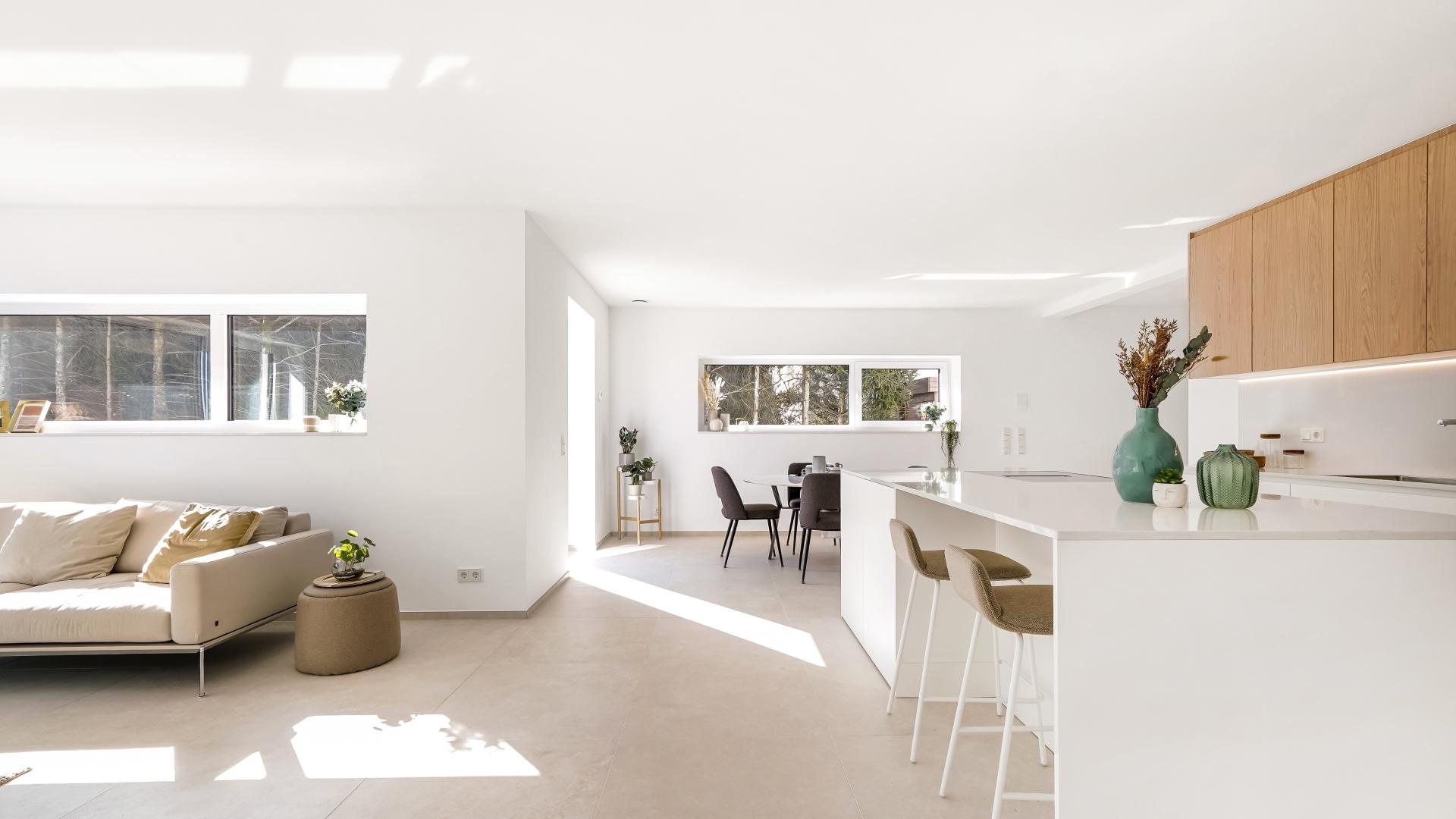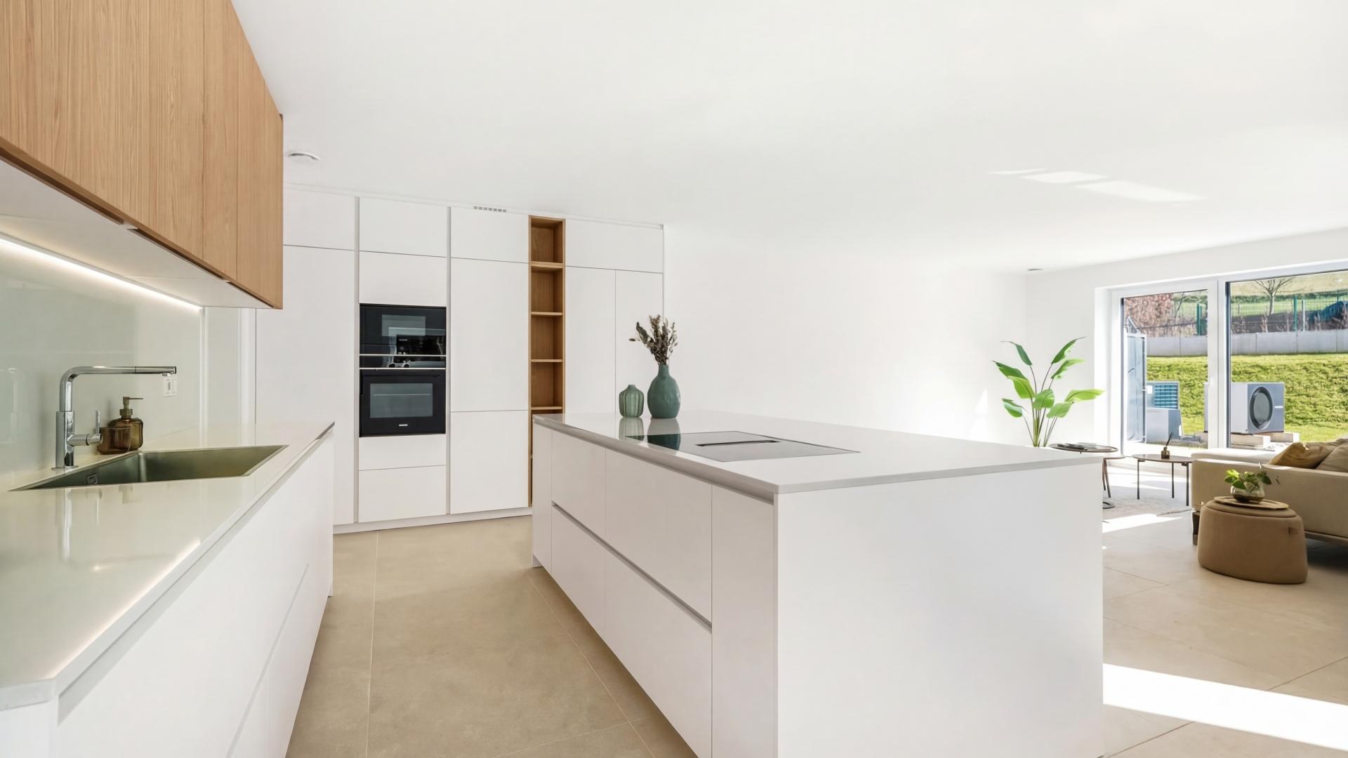 The ground floor offers an entrance hall, a fully equipped open kitchen leading to a spacious living area with access to a 37 sqm terrace and a garden, a pantry, a separate toilet, as well as a garage for two cars and two spaces outside.