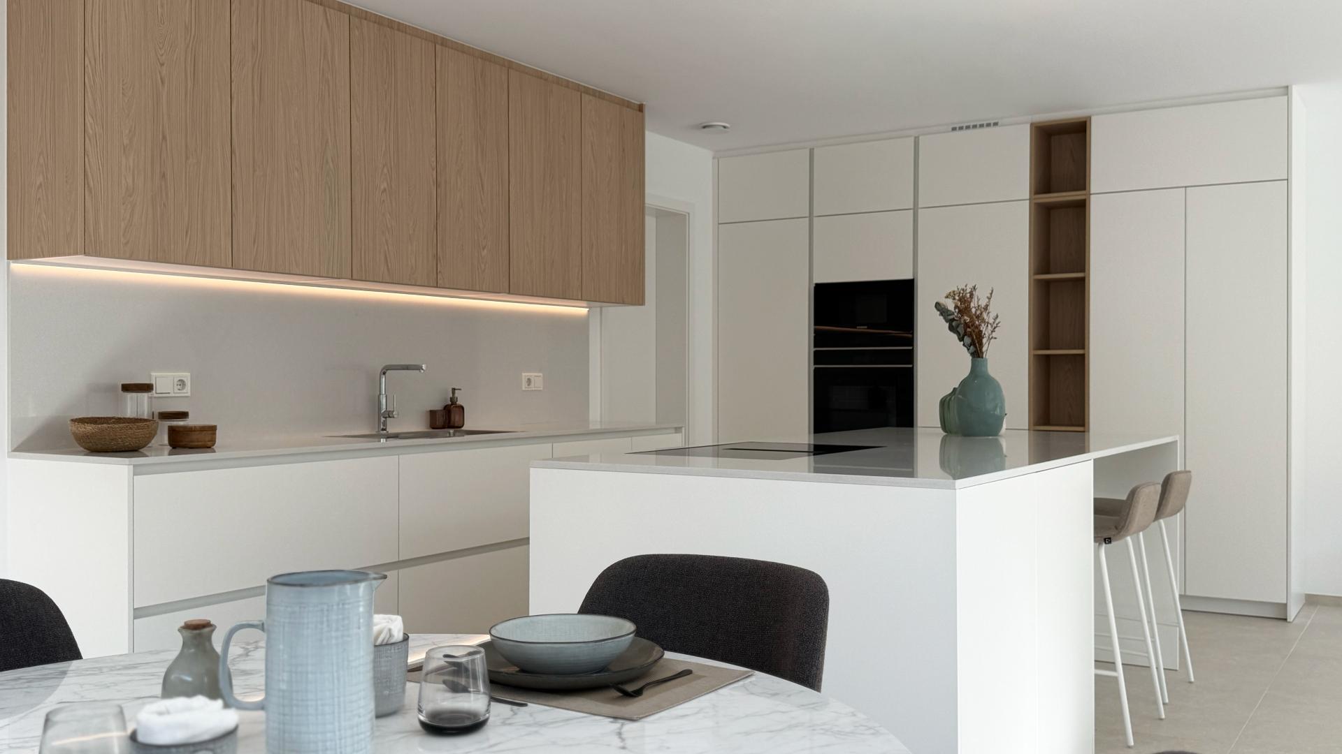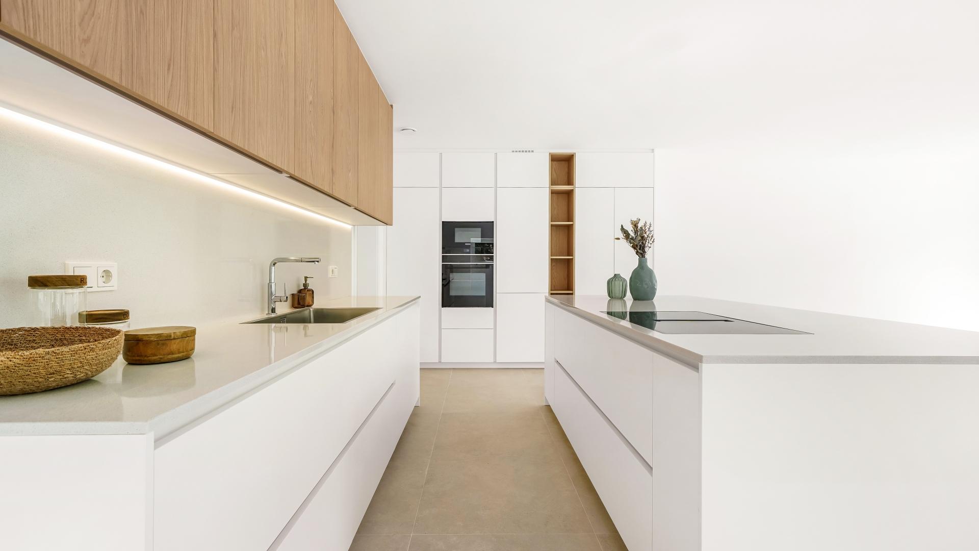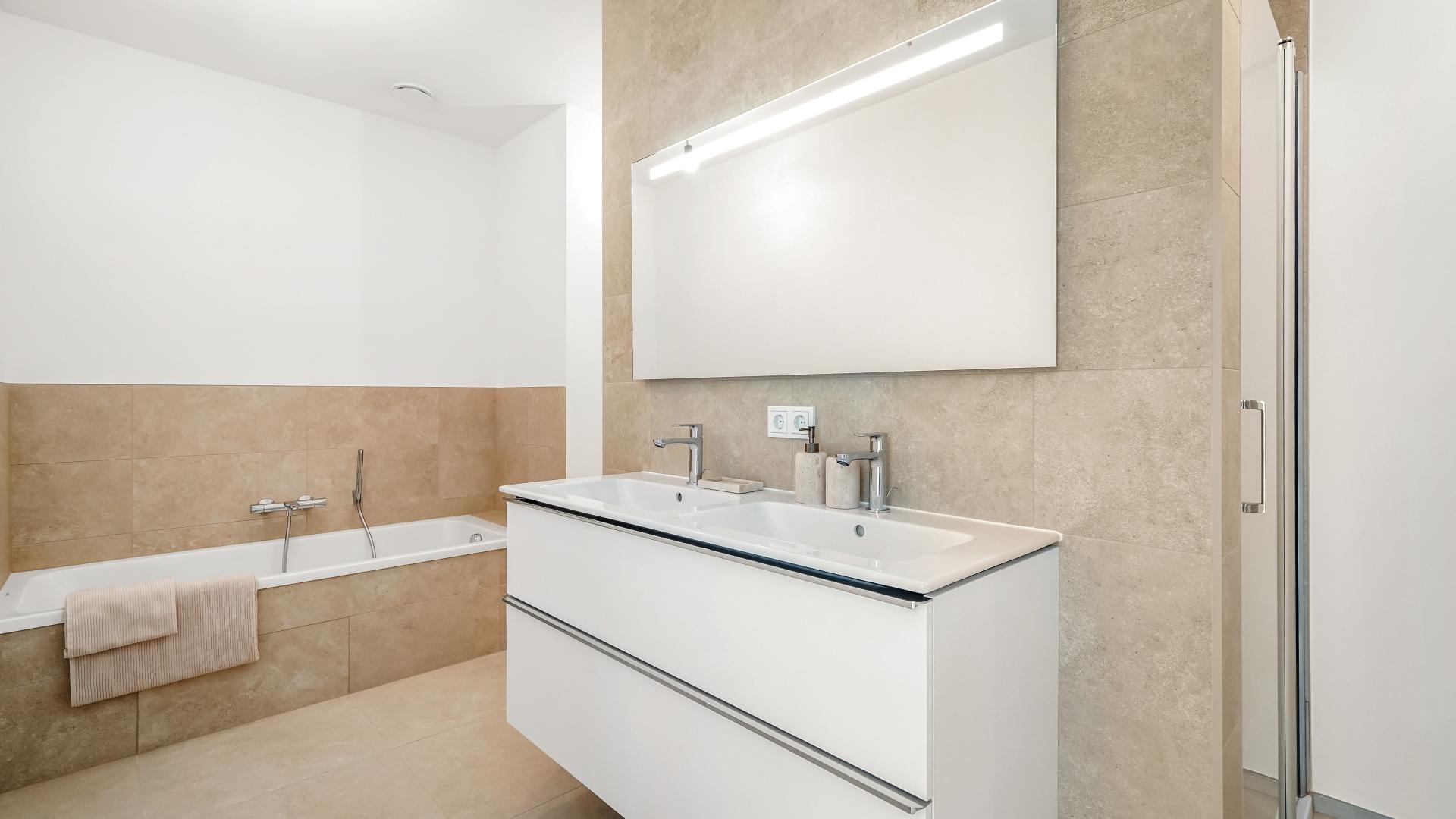 The ground floor offers an entrance hall, a fully equipped open kitchen leading to a spacious living area with access to a 37 sqm terrace and a garden, a pantry, a separate toilet, as well as a garage for two cars and two spaces outside.