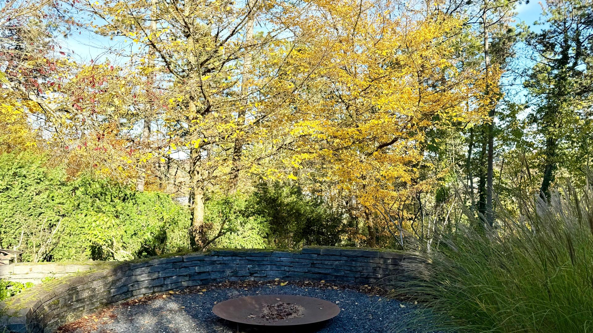 Le jardin paysagé, préservé des regards avec un espace détente articulé autour d'un brasero, enveloppe la maison d’un calme rare.