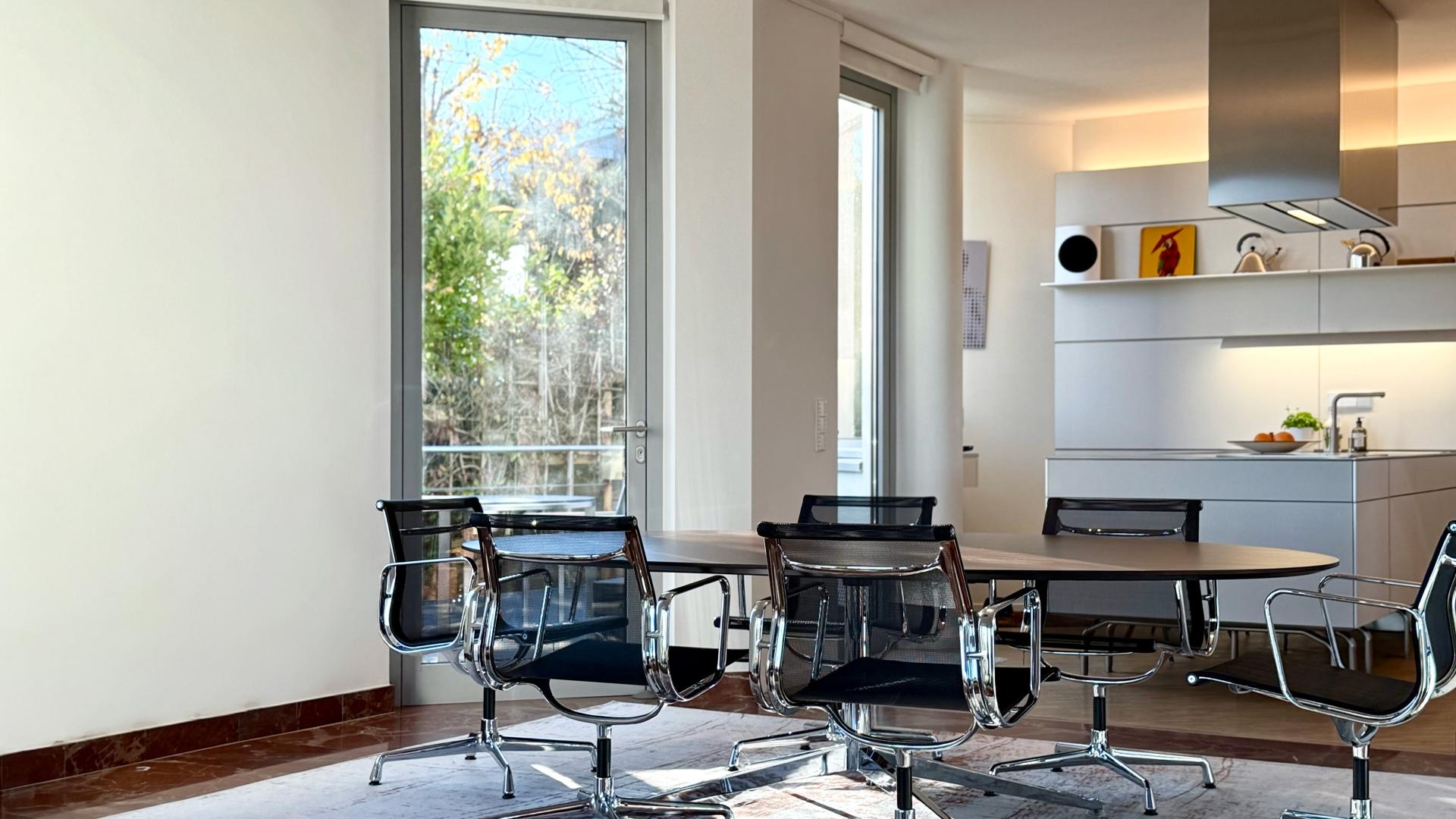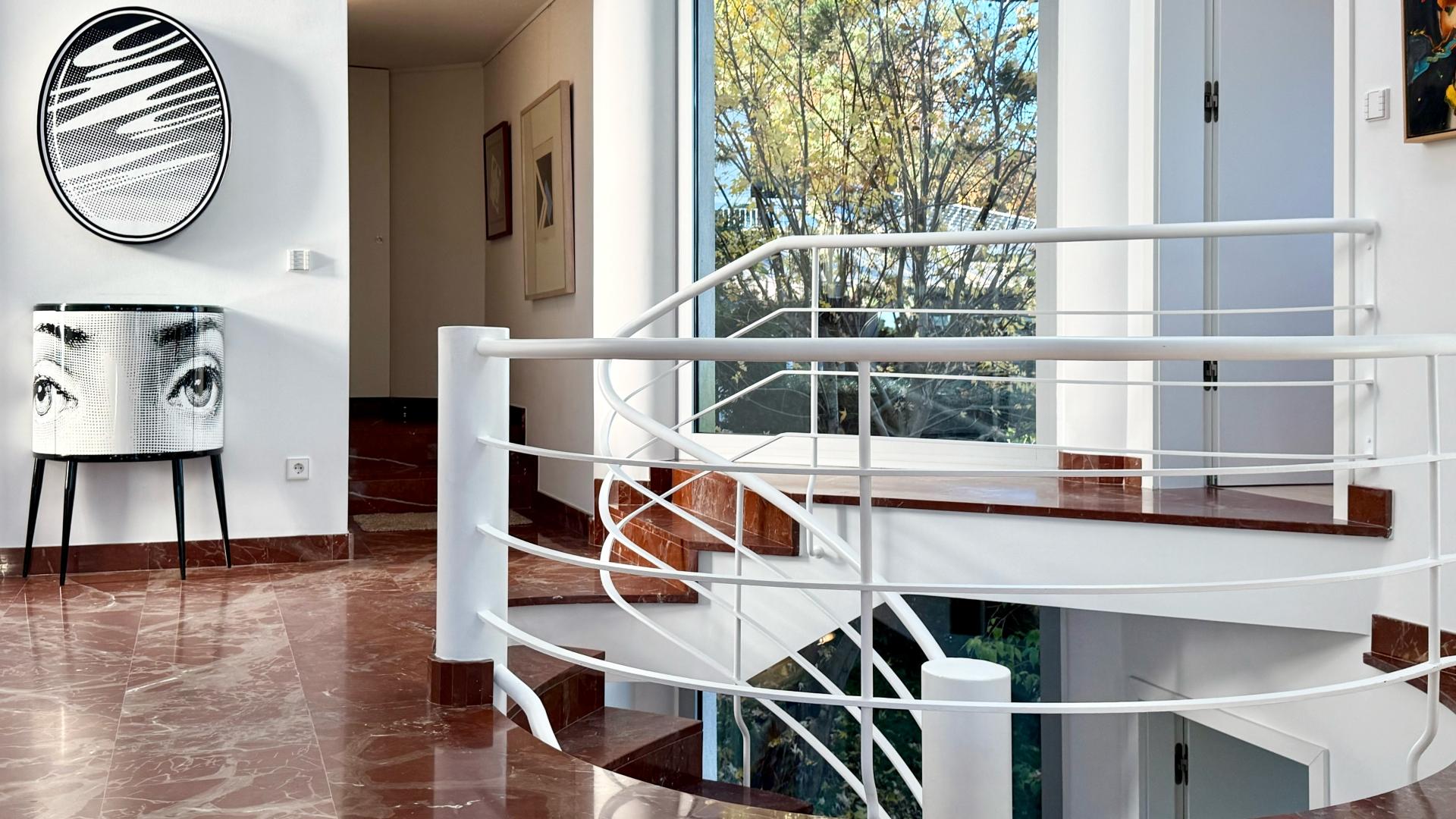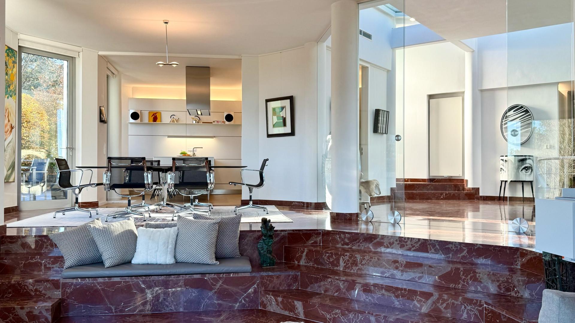 A spacious, light-filled central hall distributes the living areas according to a rare three-leaf clover layout — the true signature of the property. The living room with fireplace, the dining room and the library are all arranged around the heart of the home. The kitchen, in perfect continuity with the overall design, opens onto a terrace that feels suspended among the surrounding treetops. This level also includes a study with access to a second rooftop terrace offering breathtaking panoramic views, as well as a cloakroom connecting to a two-car garage.
